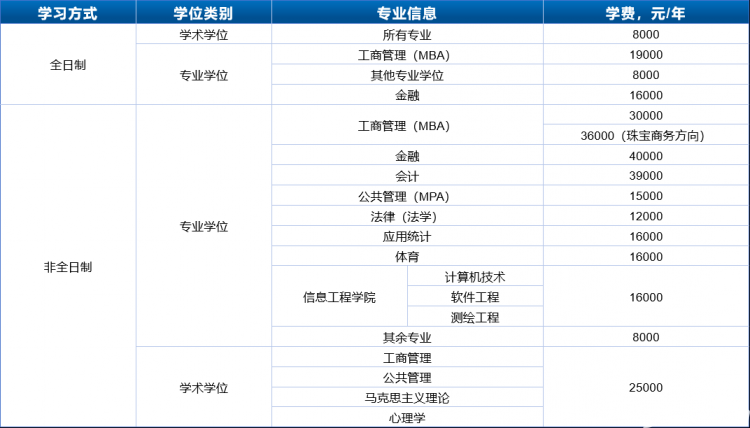 全日制:19000/年,总计57000元。 非全日制:30000/年,总计90000元。 非全日制:(珠宝商务方向)36000/年,总计108000元。 | ||||
